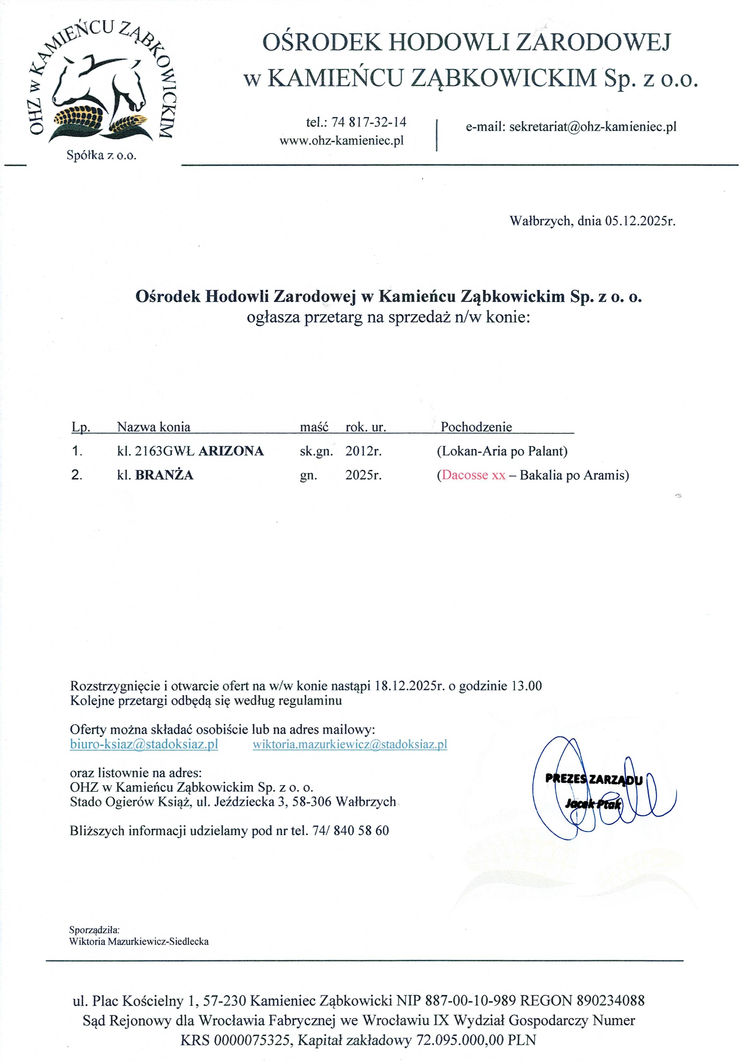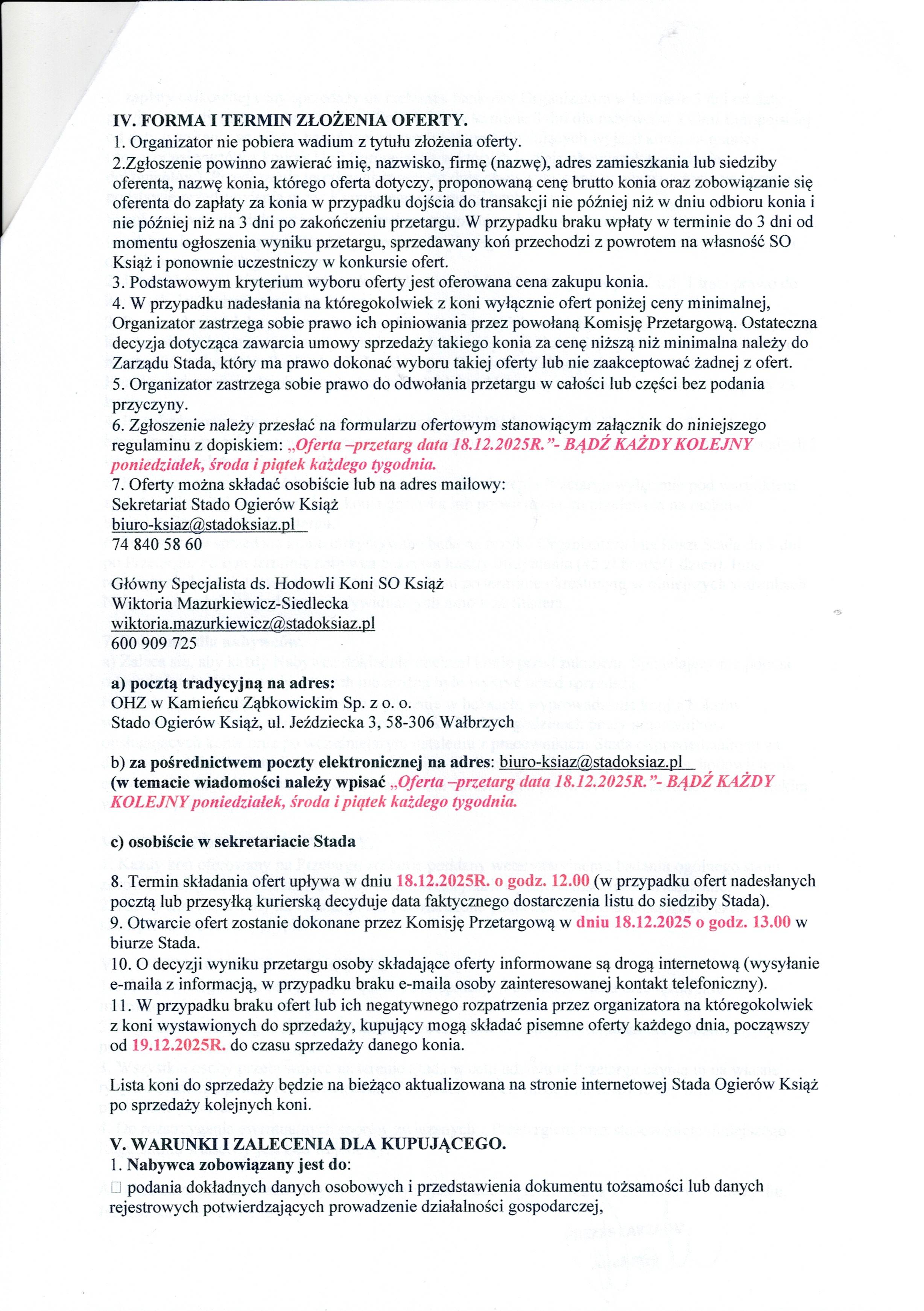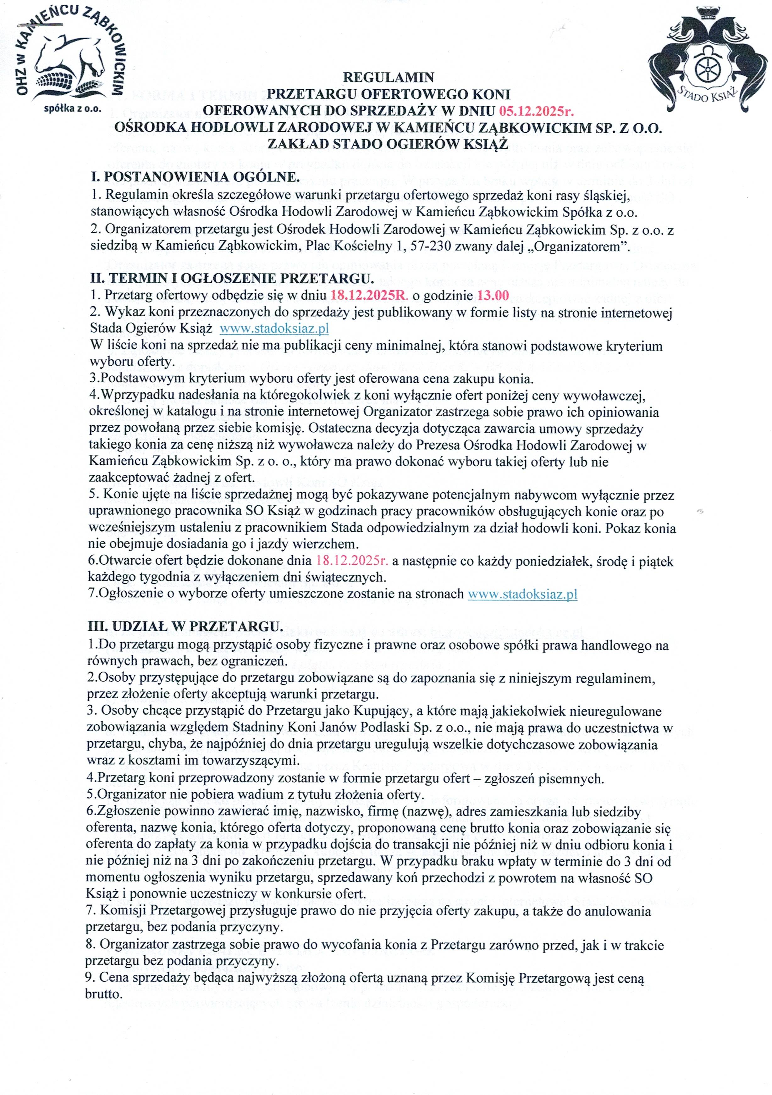 Rozstrzygnięcie i otwarcie ofert na w/w konie nastąpi 18.12.2025r. o godzinie 13.00