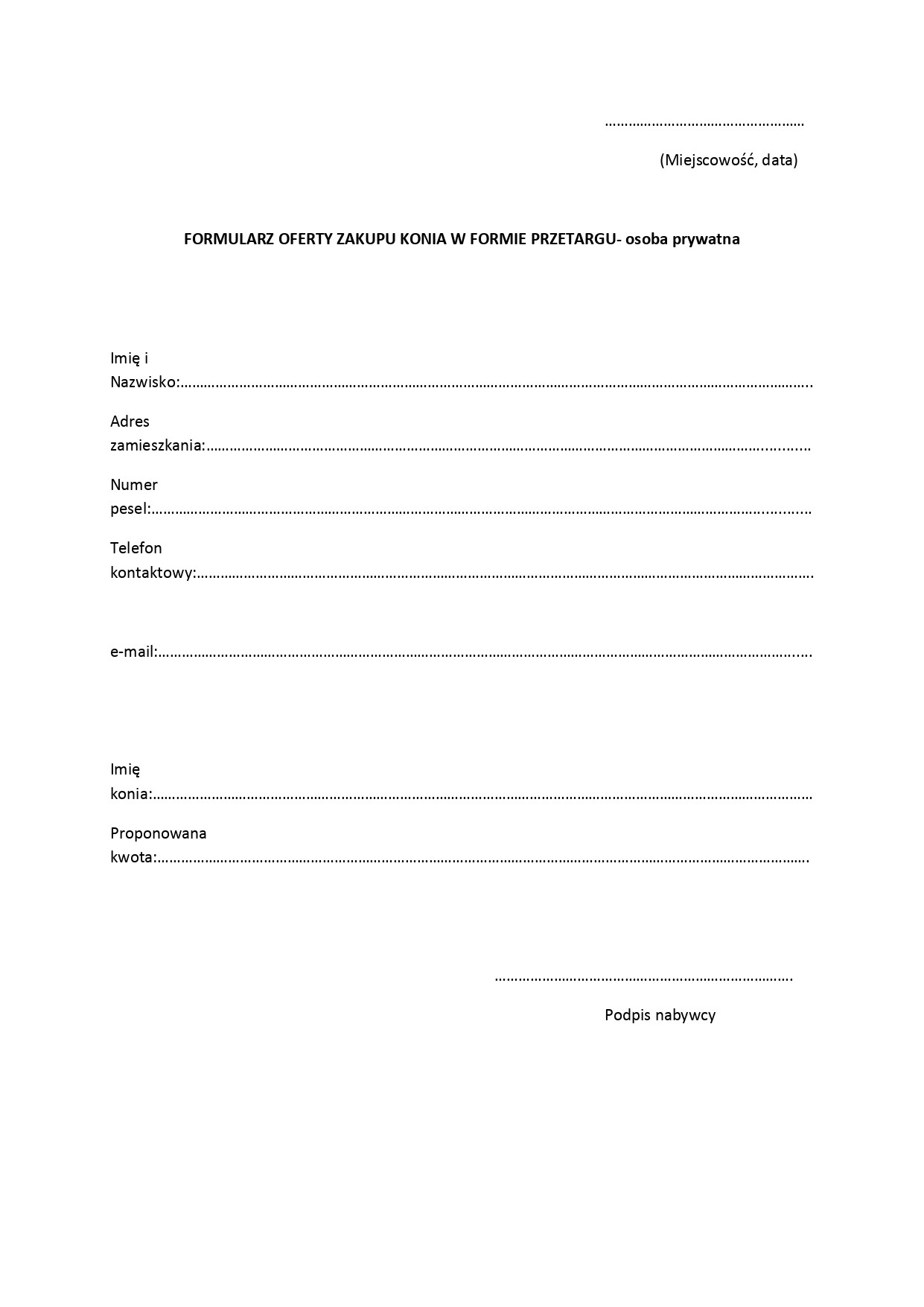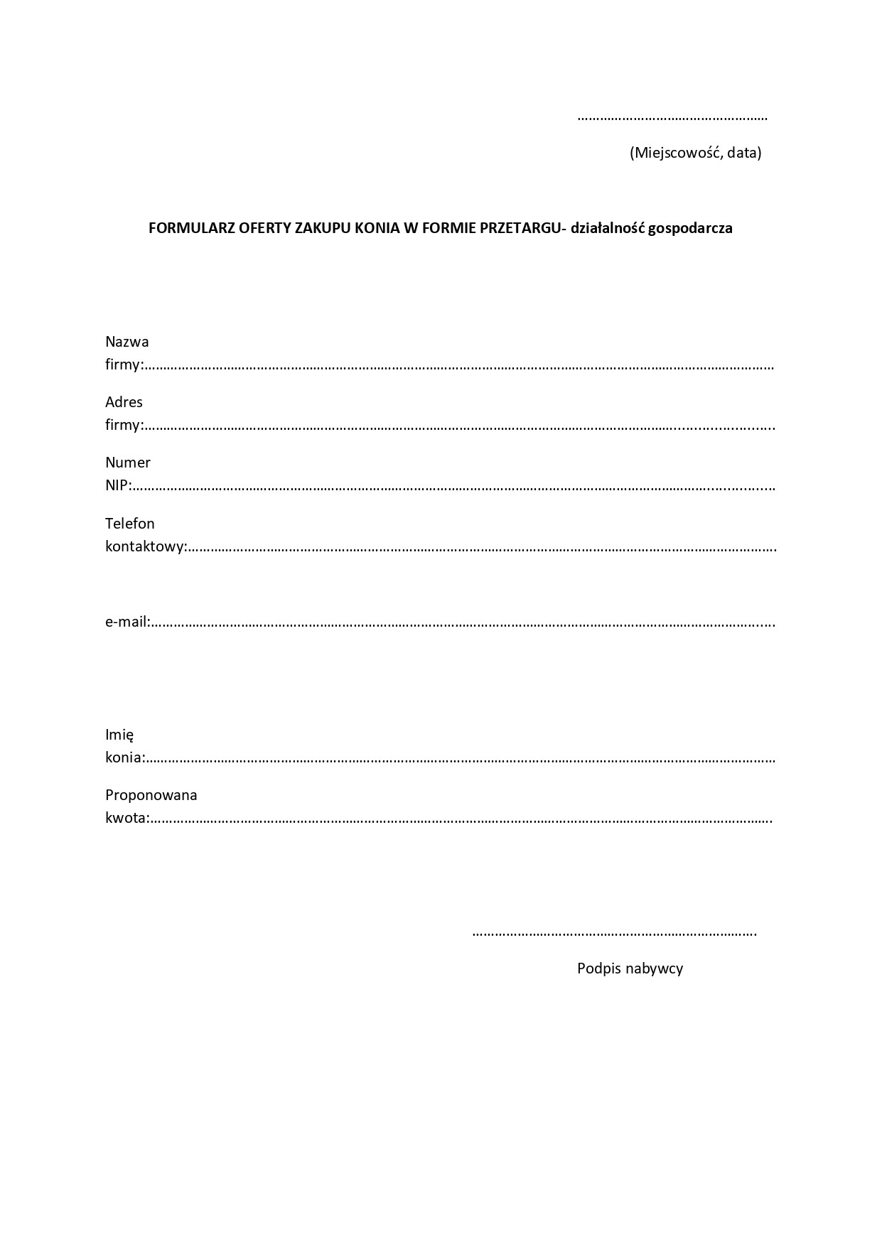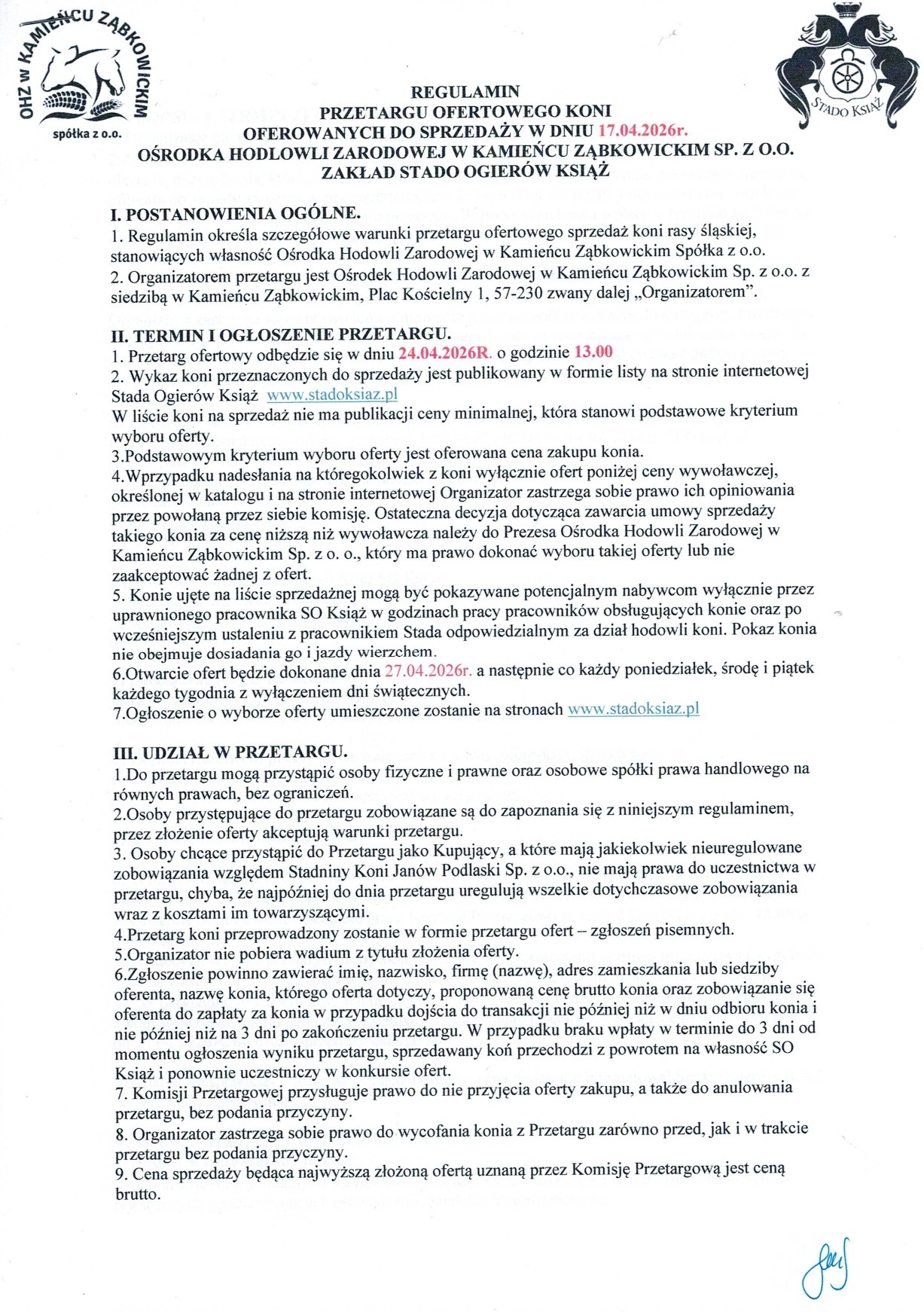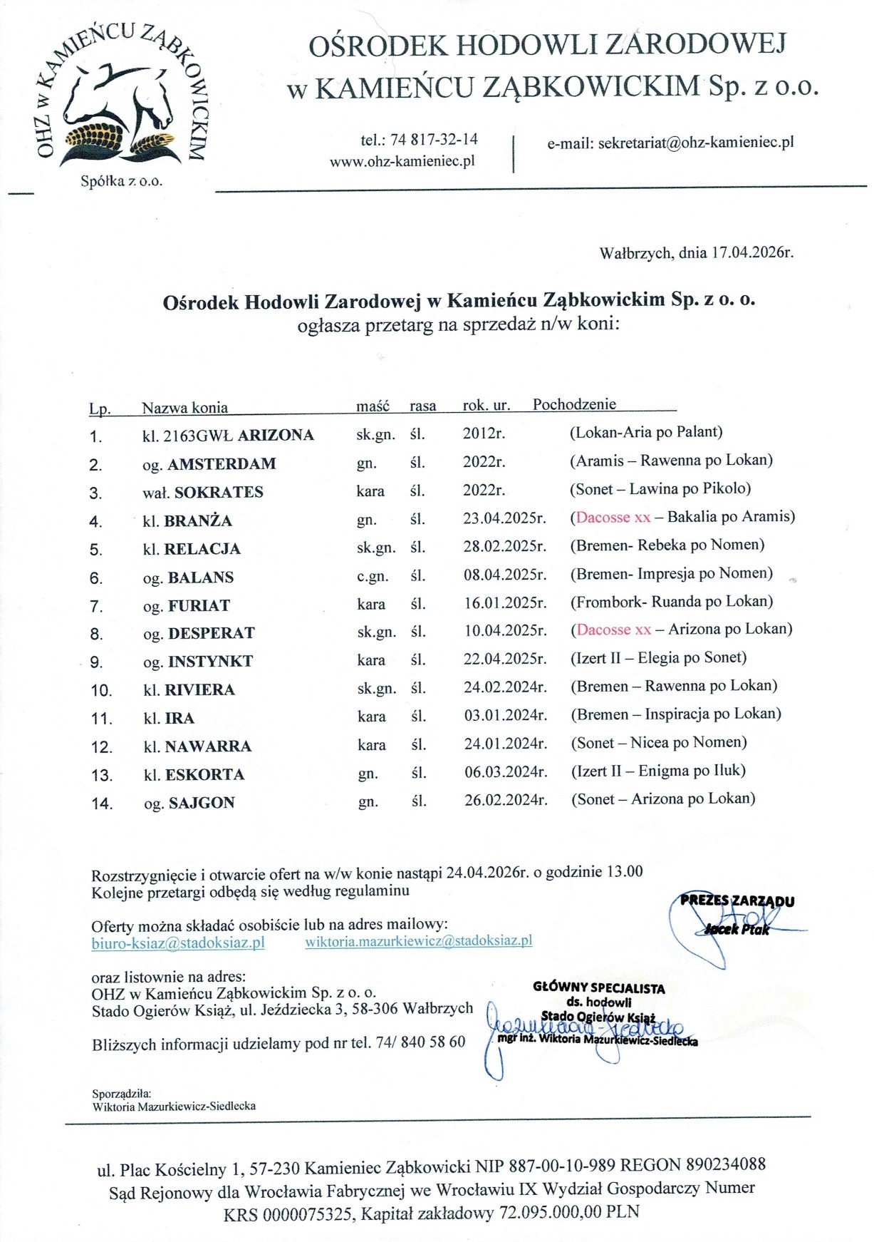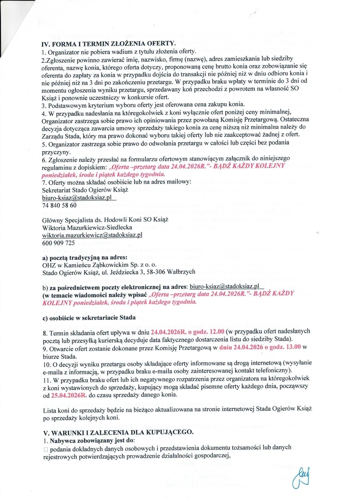 Rozstrzygnięcie i otwarcie ofert na w/w konie nastąpi 24.04.2026r. o godzinie 13.00