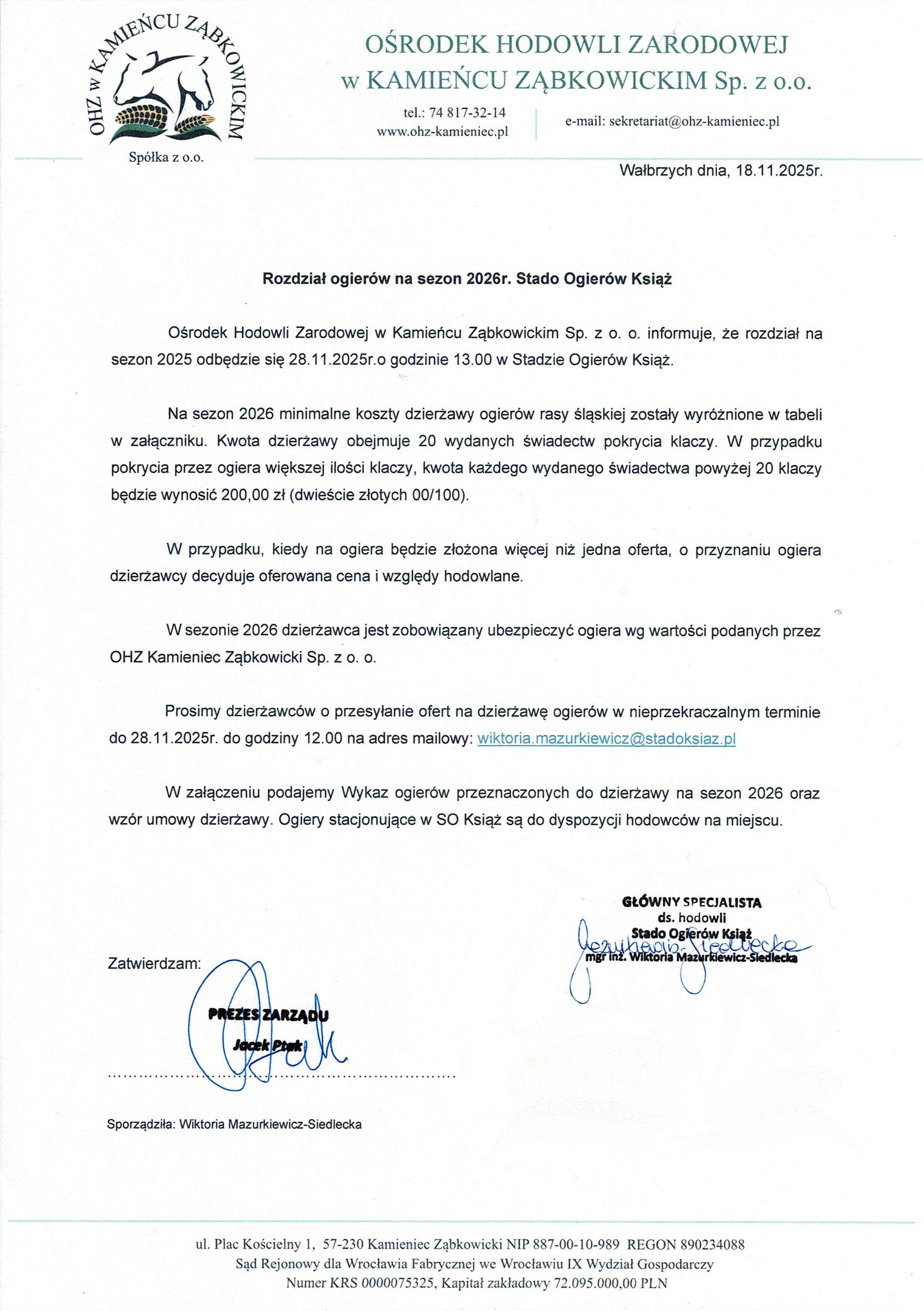 Ośrodek Hodowli Zarodowej w Kamieńcu Ząbkowickim Sp. z o. o. informuje, że rozdział na sezon 2026 odbędzie się 28.11.2025r.o godzinie 13.00 w Stadzie Ogierów Książ.