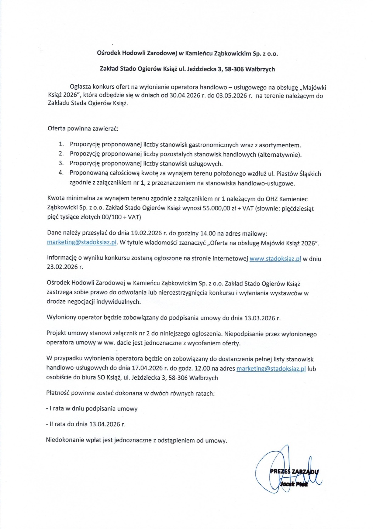 Dane należy przesyłać do dnia 19 lutego 2026r. do godziny 14.00 na adres mailowy : marketing@stadoksiaz.pl.